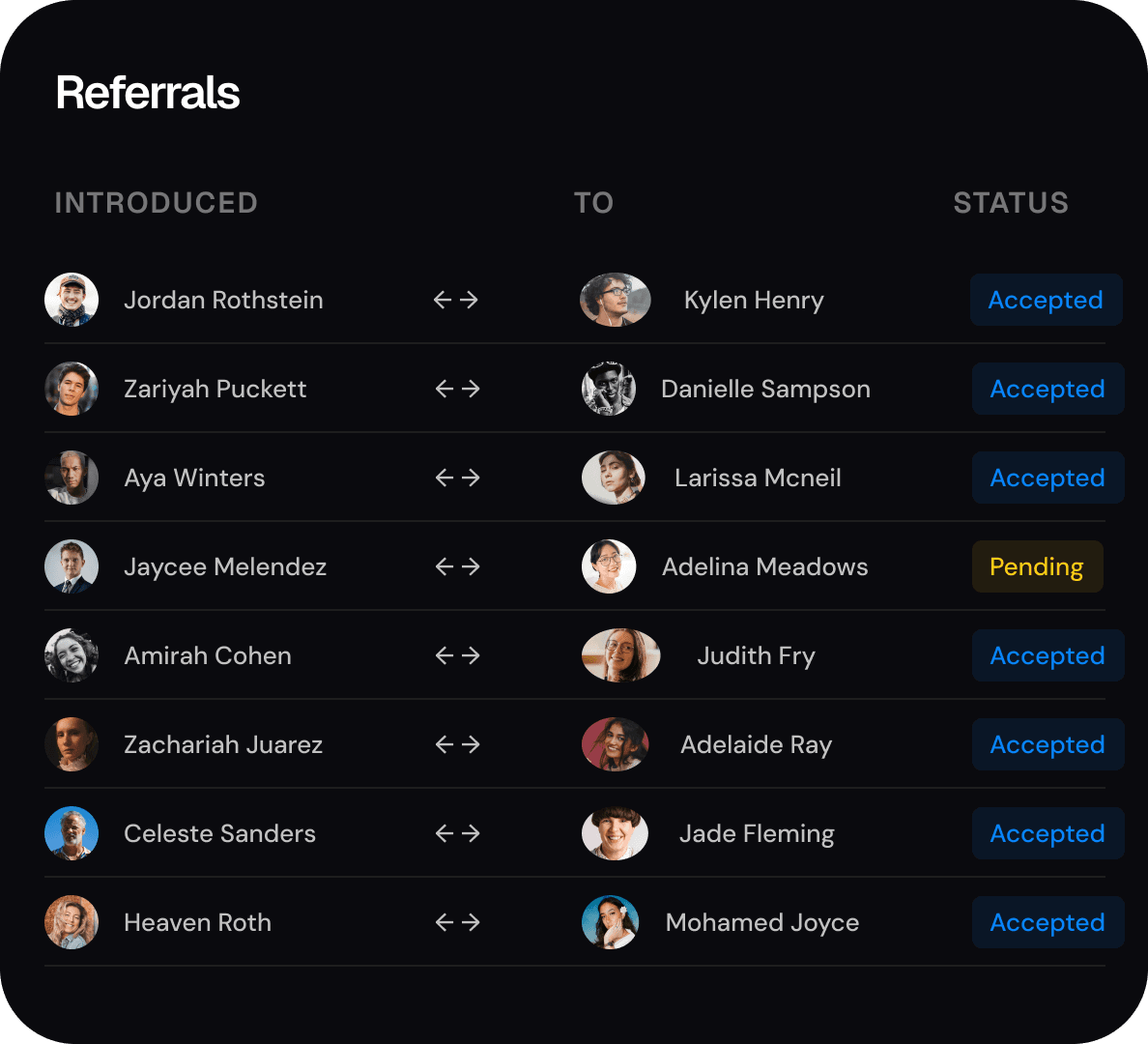 Facilitate warm introductions, track their ripple effects, and maintain total visibility over every connection you’ve made or received.